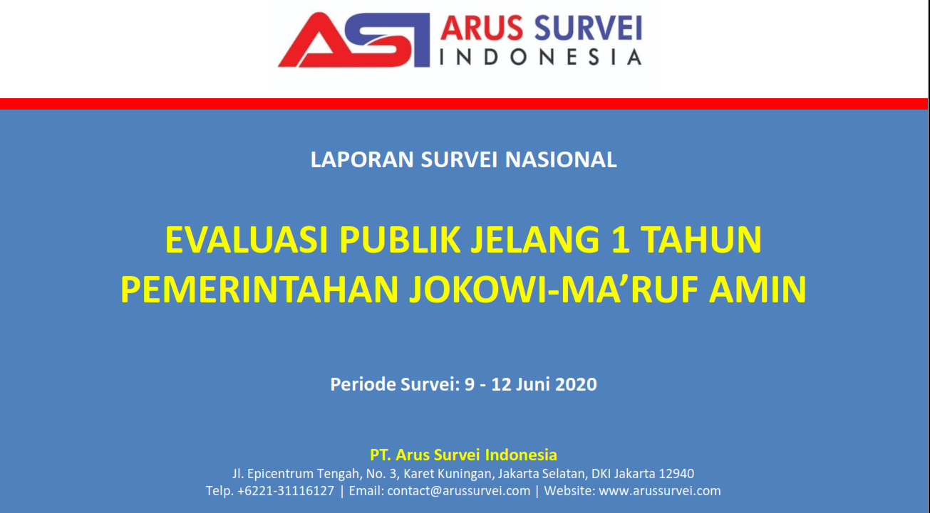 Lembaga Arus Survei Indonesia (ASI) merilis hasil survei nasional bertema “Evaluasi Publik Jelang 1 Tahun Pemerintahan Jokowi-Ma’ruf Amin”. Survei dilaksanakan pada 9 – 12 Juni 2020 di 34 provinsi di Indonesia dengan cara telesurvei, yaitu responden diwawancara melalui kontak telepon menggunakan kuesioner. Metode penarikan sampel Multistage Random Sampling. Jumlah responden 1000 responden dengan margin of error +/- 3.1% pada tingkat kepercayaan 95%.